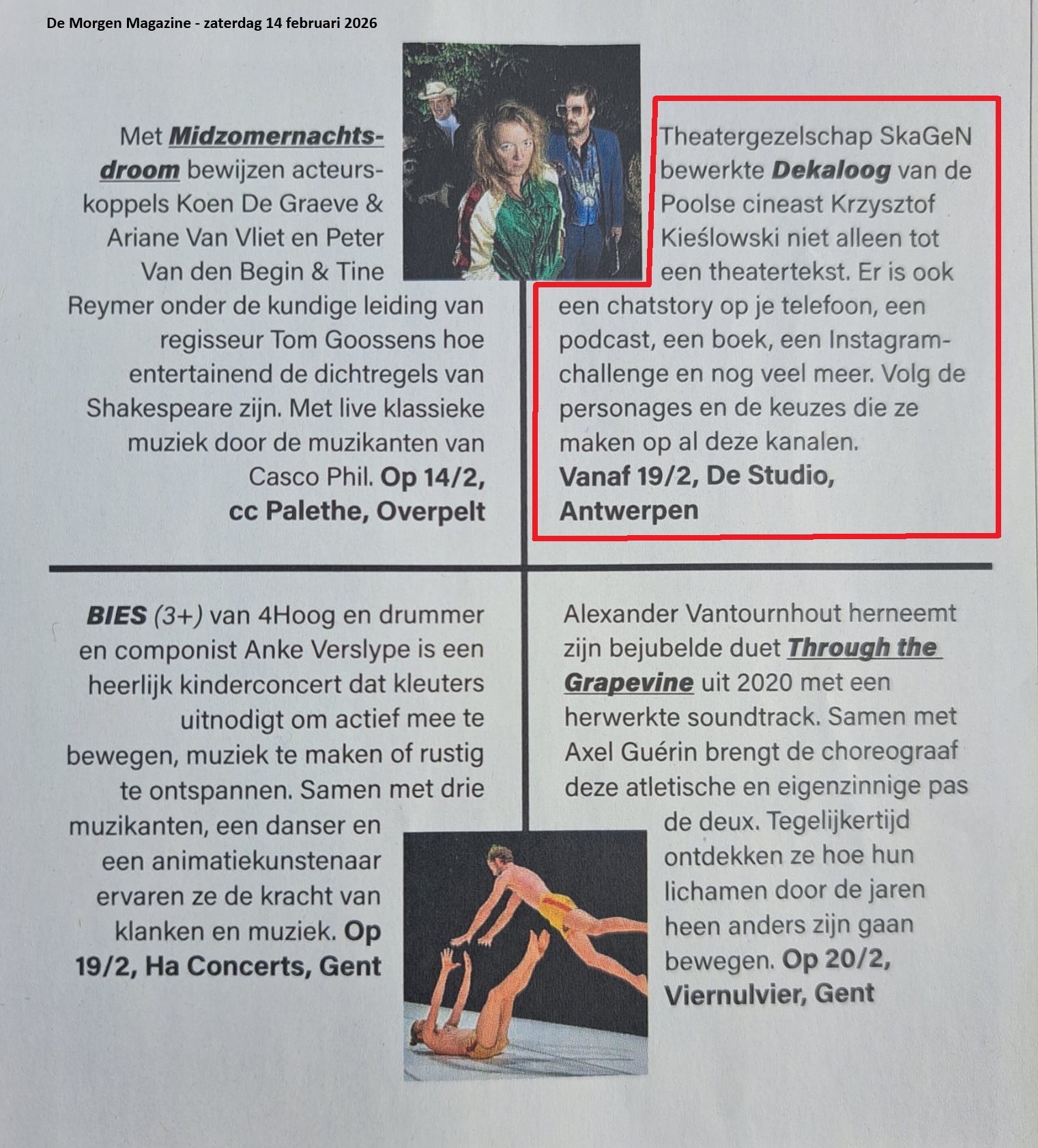 Van en met Clara van den Broek, Mathijs F Scheepers, Korneel Hamers, Valentijn Dhaenens, Dagmar Dierick, Tristan Feyten en Clara Cleymans - Kostuums: Barbara Delaere - Compositie: Tim Vets - Technische leiding: Eric Engels - Uitvoerend technicus: Joaquin De Rycke - Zakelijk leiding en coördinatie: Korneel Hamers - Productieleiding: Kaat Haelen en Lio Merckx - Kantoor: Sien Wils - Promotiebeelden en layout: Lidia Nagibina - Productie: SKaGeN & De Studio, PerPodium - Met steun van de Vlaamse Gemeenschap, Tax Shelter voor de podiumkunsten