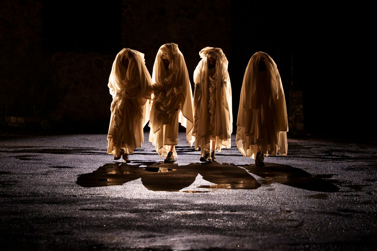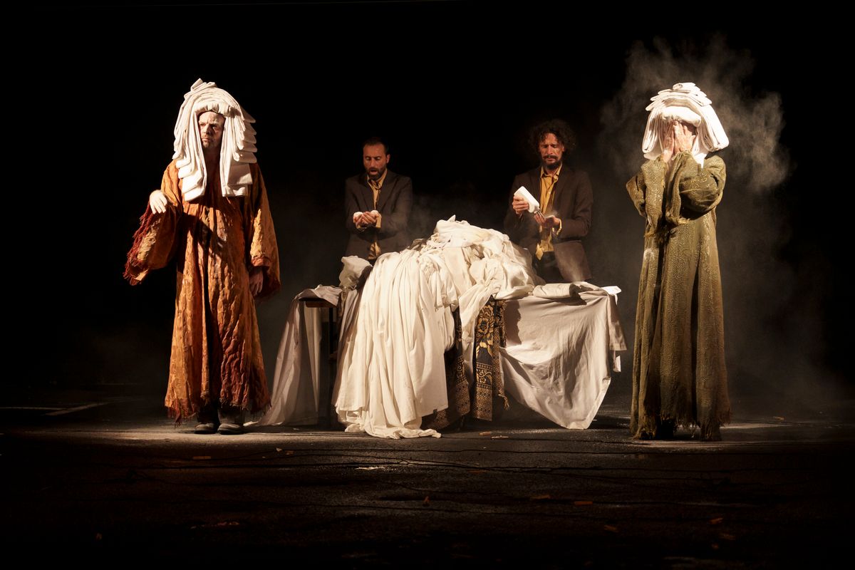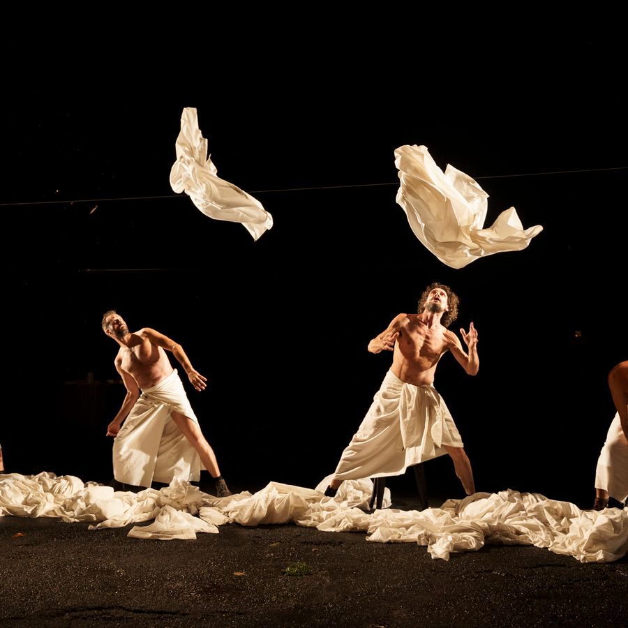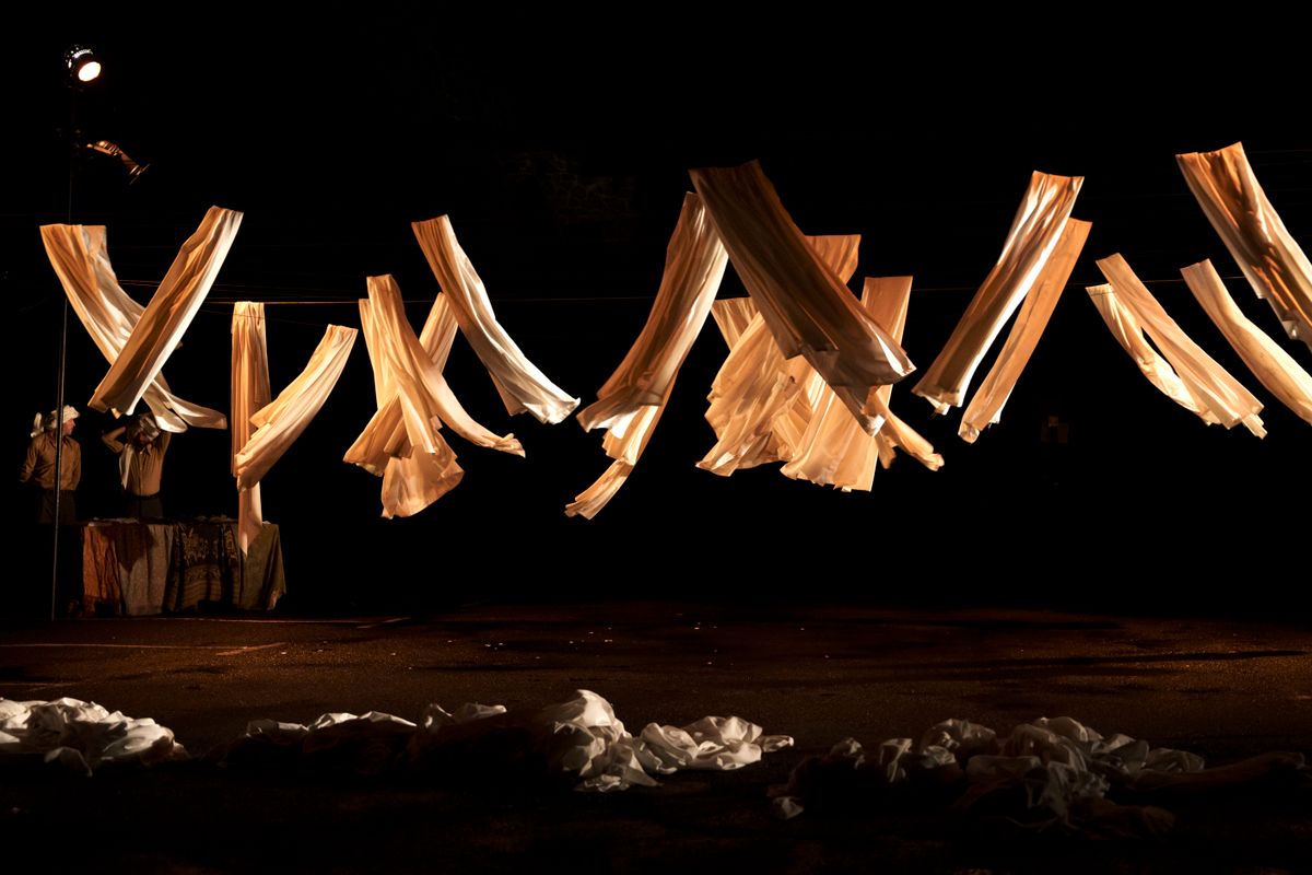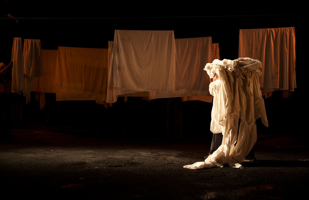 Het laken wordt afwisselend gedragen, geslagen, gewassen, achtergelaten, uitgerekt en opgevouwen. Afhankelijk van hoe het wordt gemanipuleerd, verandert het in een omhulsel, een kostuum, een hoofdtooi, een accessoire, een operadecor.