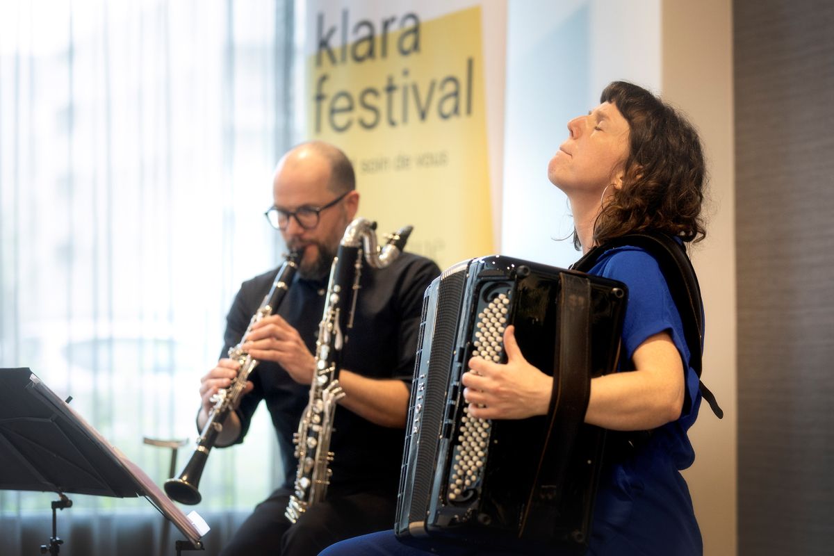 Samen weven ze 'Verhalen zonder woorden' die Sara brengt met klarinettist Jean-Philippe Poncin.