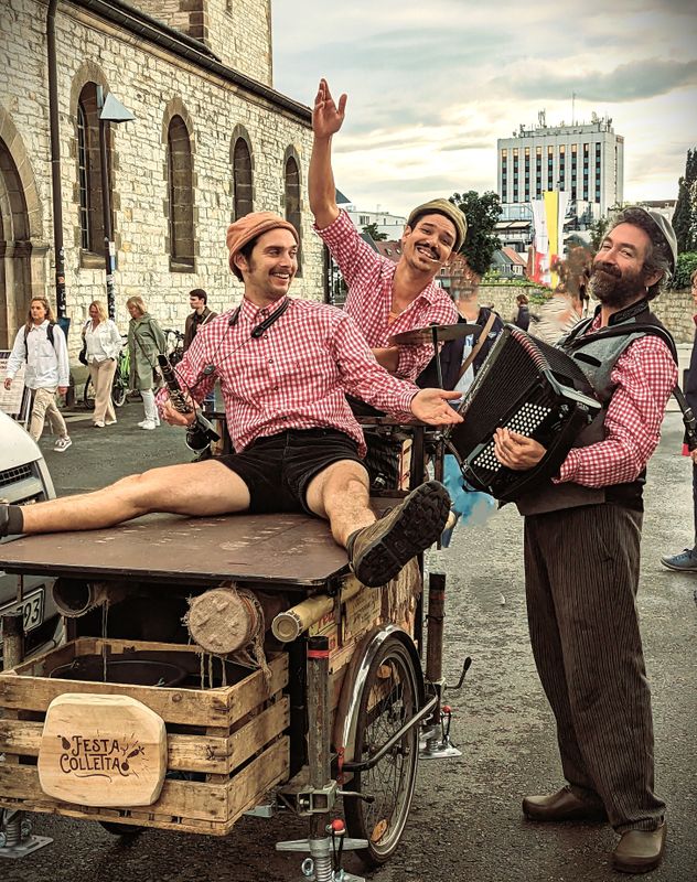 Rond hun fiets uitgerust met podium en geluidsinstallatie brengen zij hun show met jonglerie, acrobatie, dans, muziek en veel ambiance.