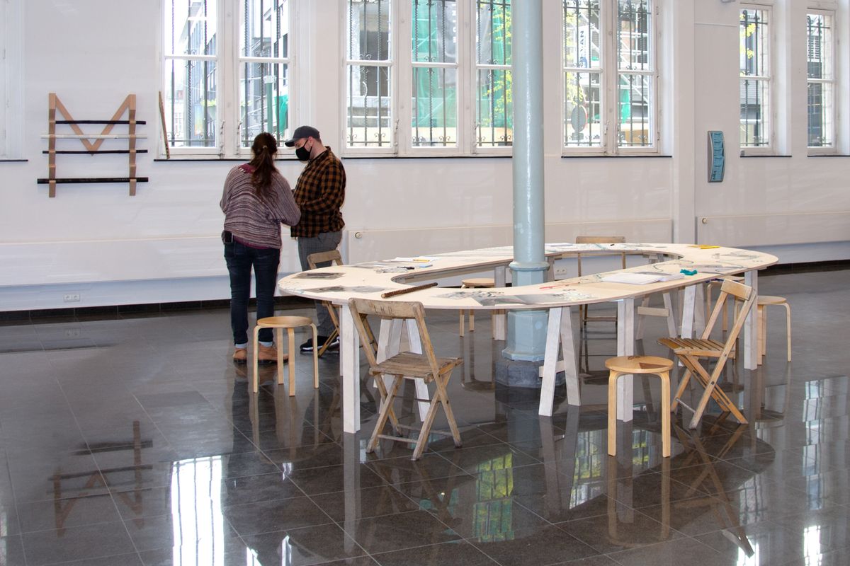 Centraal in haar tentoonstelling in Ter Posterie is een voor de zaal met pilaren ontworpen schraagtafel in multiplex. De tafel verwijst naar de letter T (Trestle Table n°2). De bovenbladen steunen op schragen, verwijzend naar de letter A en zijn digitaal bedrukt met een grafische collage. Dit kunstwerk is resultaat van een samenwerking met kunstenaar Wim Wauman en met grafisch ontwerpster Hadewych Becuwe, met wie Kelly Schacht reeds langere tijd een artistiek traject aflegt. Symbolisch staat de tafel voor communicatie en een plek van ontmoeting. De bezoeker wordt uitgenodigd om aan te schuiven en boeken en objecten prikkelen tot reflecties en gesprekken.